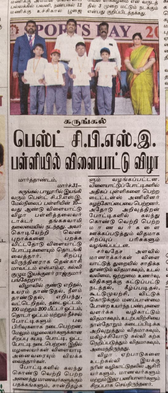 Based on Chairman's long term dream , he has started this BEST School to give the best to students by moulding them as IAS & other higher officials, talented Doctors, great Scientist, famous Sports personalities and best Philosophers of the country in future.
